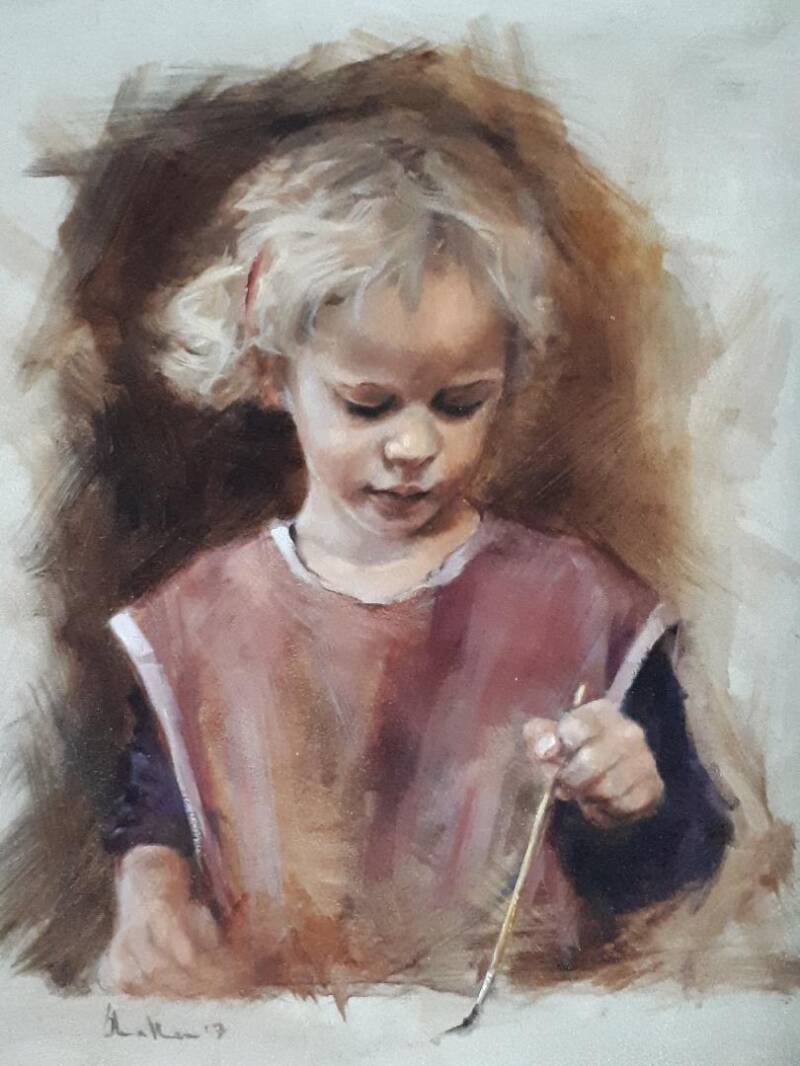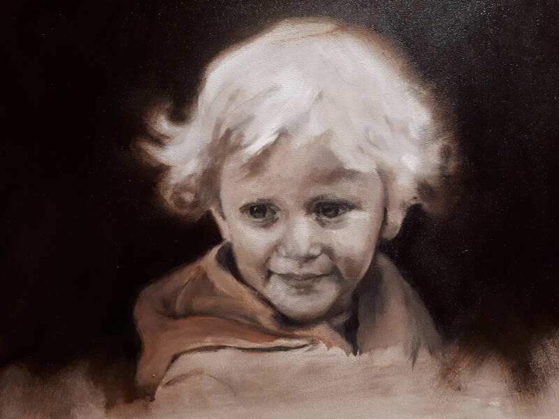 Ik werk op dit moment aan een portretstudie, ten voeten uit, van Peter in de rol als Willem I in een koningsdrama. In deze studie beperk ik me tot een onderschildering, met maar een paar kleuren. Op dezer manier doe ik studie naar licht en donker in dit portret, waarbij het gezicht wit geschminkt is.
